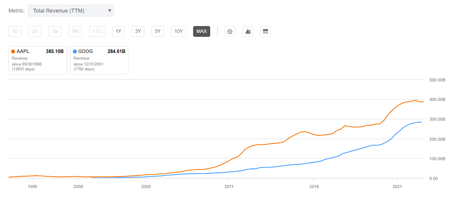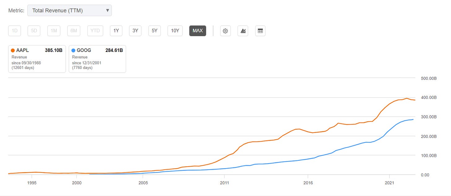 المنافسة بين جووجل وأبل على سبيل المثال كانت مفيدة بالطبع لنا كمستهلكين ولكنها في المقابل كانت مفيدة لهم كذلك. فمن خلال الرسم البياناني أدناه، يتضح لنا كيف تضاعفت مداخيل الشركتين بشكل كبيرخلال الوقت. وخلال هذا التنافس تطورت شركة أبل من شركة تبيع الهواتف والأجهزة إلى شركة دخلت القطاع المالي من خلال Apple Pay وقطاع الواقع المعزز وأجبرت جووجل على بناء نظام تشغيل Android وتطوير Google Pay.