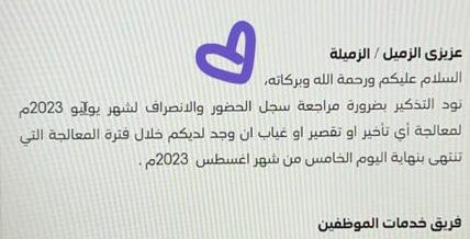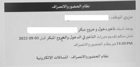 تصفحت قصة أحد الأصدقاء في سناب شات والذي كان مستاء جدًا من عمله السابق وطريقة تعاملهم معه، وقد وضع صورة لأحد رسائل البريد الإلكتروني التي تلقاها من الموارد البشرية بعنوان "مسائلة إلكترونية" تقول عزيزي الموظيف يوجد لديك تأخير دخول وخروج مبكر نأمل منكم تقديم مبررات التأخير قبل تاريخ … وبتوقيع "نظام الحضور والانصراف - المسائلات الإلكترونية".